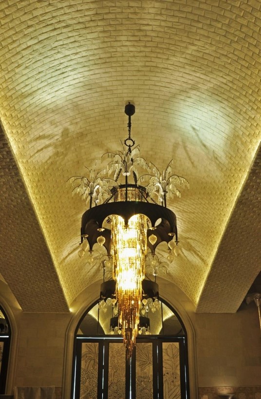 Dining hall for 1,800 people without any support poles. Fountains and towers in the garden.